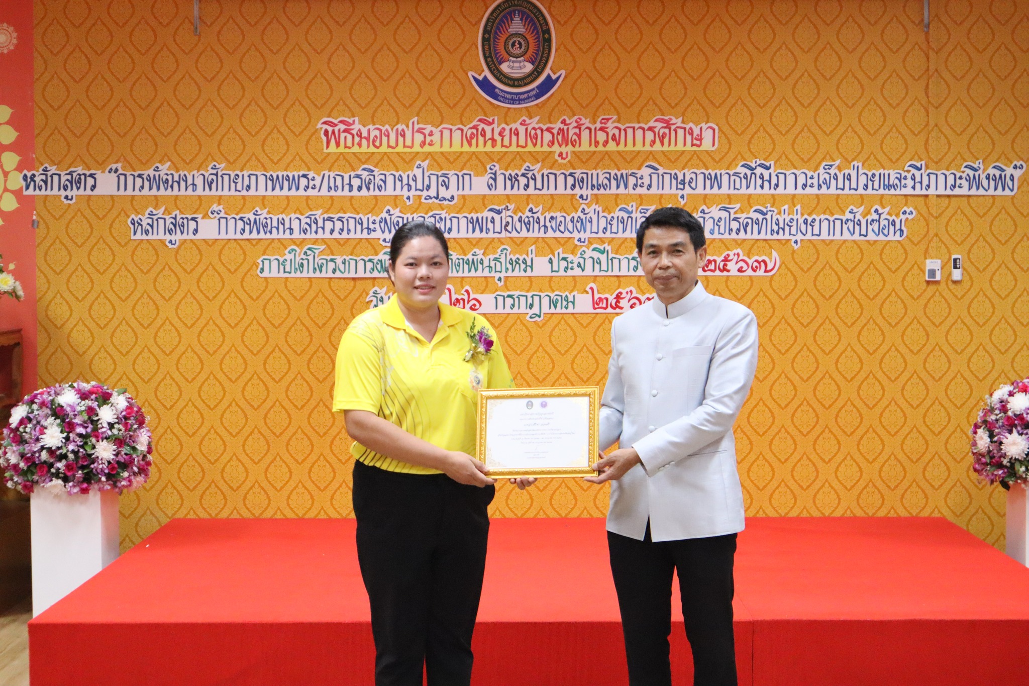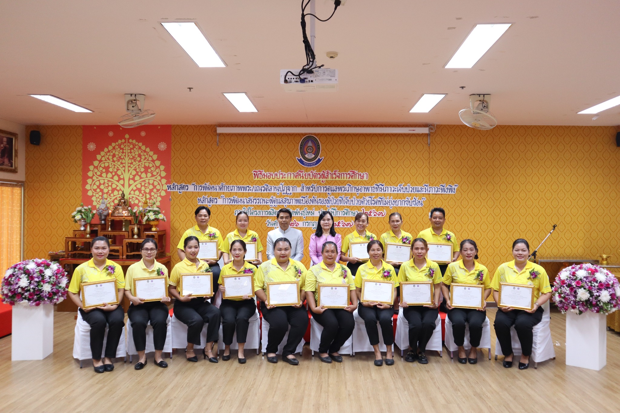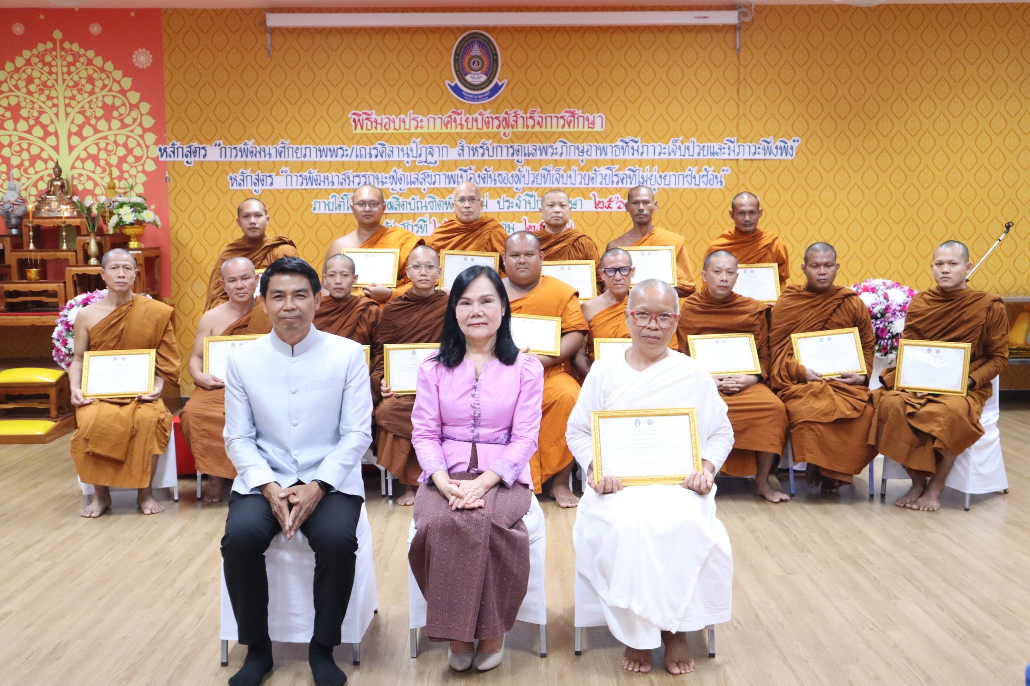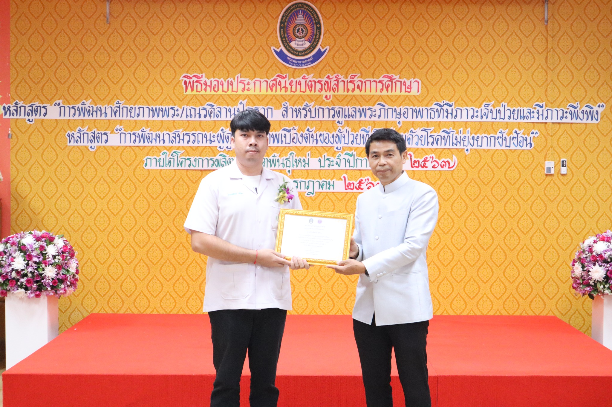 พิธีมอบประกาศนียบัตรผู้ผ่านการอบรมหลักสูตร “การพัฒนาศักยภาพพระ/เณรคิลานุปัฏฐาก สำหรับการดูแลพระภิกษุอาพาธที่มีภาวะเจ็บป่วยและมีภาวะพึ่งพิง” หลักสูตร“การพัฒนาสมรรถนะผู้ดูแลสุขภาพเบื้องต้นของผู้ป่วยที่เจ็บป่วยด้วยโรคที่ไม่ยุ่งยากซับซ้อน” ภายใต้โครงการผลิตบัณฑิตพันธุ์ใหม่ ปี พ.ศ. ๒๕๖๗ -- วันที่ ๒๖ กรกฎาคม ๒๕๖๗ คณะพยาบาลศาสตร์ จัดพิธีมอบประกาศนียบัตรผู้ผ่านการอบรมหลักสูตร “การพัฒนาศักยภาพพระ/เณรคิลานุปัฏฐาก สำหรับการดูแลพระภิกษุอาพาธที่มีภาวะเจ็บป่วยและมีภาวะพึ่งพิง” และหลักสูตร“การพัฒนาสมรรถนะผู้ดูแลสุขภาพเบื้องต้นของผู้ป่วยที่เจ็บป่วยด้วยโรคที่ไม่ยุ่งยากซับซ้อน” ภายใต้โครงการผลิตบัณฑิตพันธุ์ใหม่ ปี พ.ศ. ๒๕๖๗ โดยมี ผู้ช่วยศาสตาจารย์ศักดา บุญยืด รองอธิการบดี เป็นประธานในพิธีและมอบใบประกาศนียบัตรในครั้งนี้ ณ ห้อง ๕๒.๔๐๓ อาคารวิทยาศาสตร์สุขภาพ มหาวิทยาลัยราชภัฏอุบลราชธานี