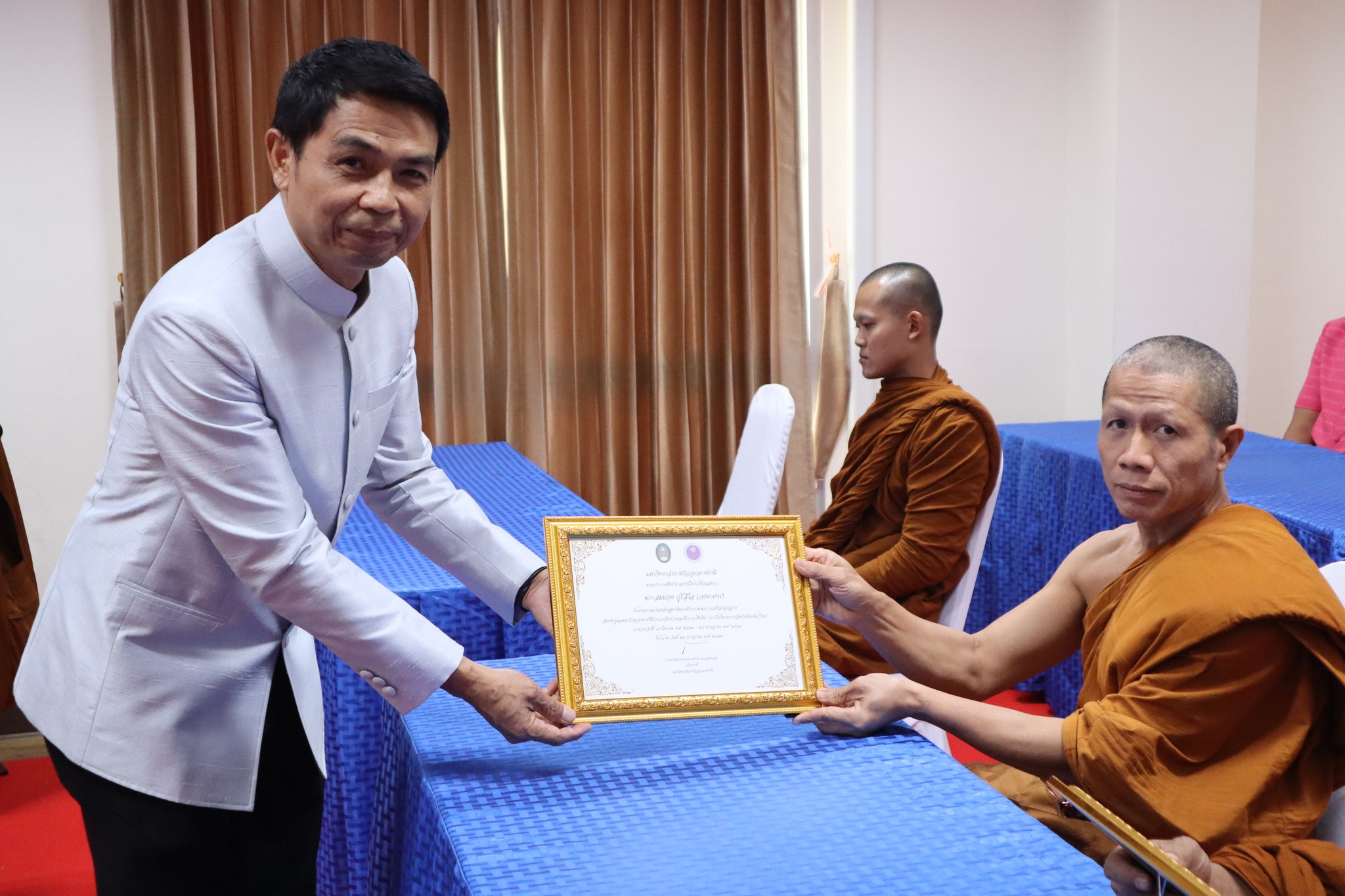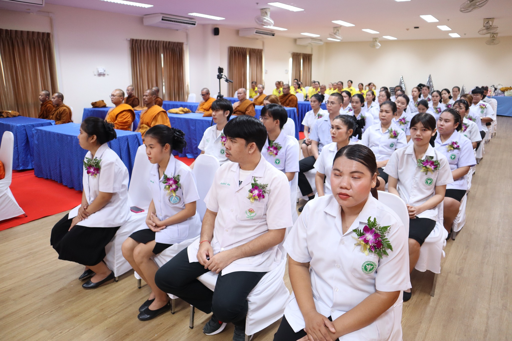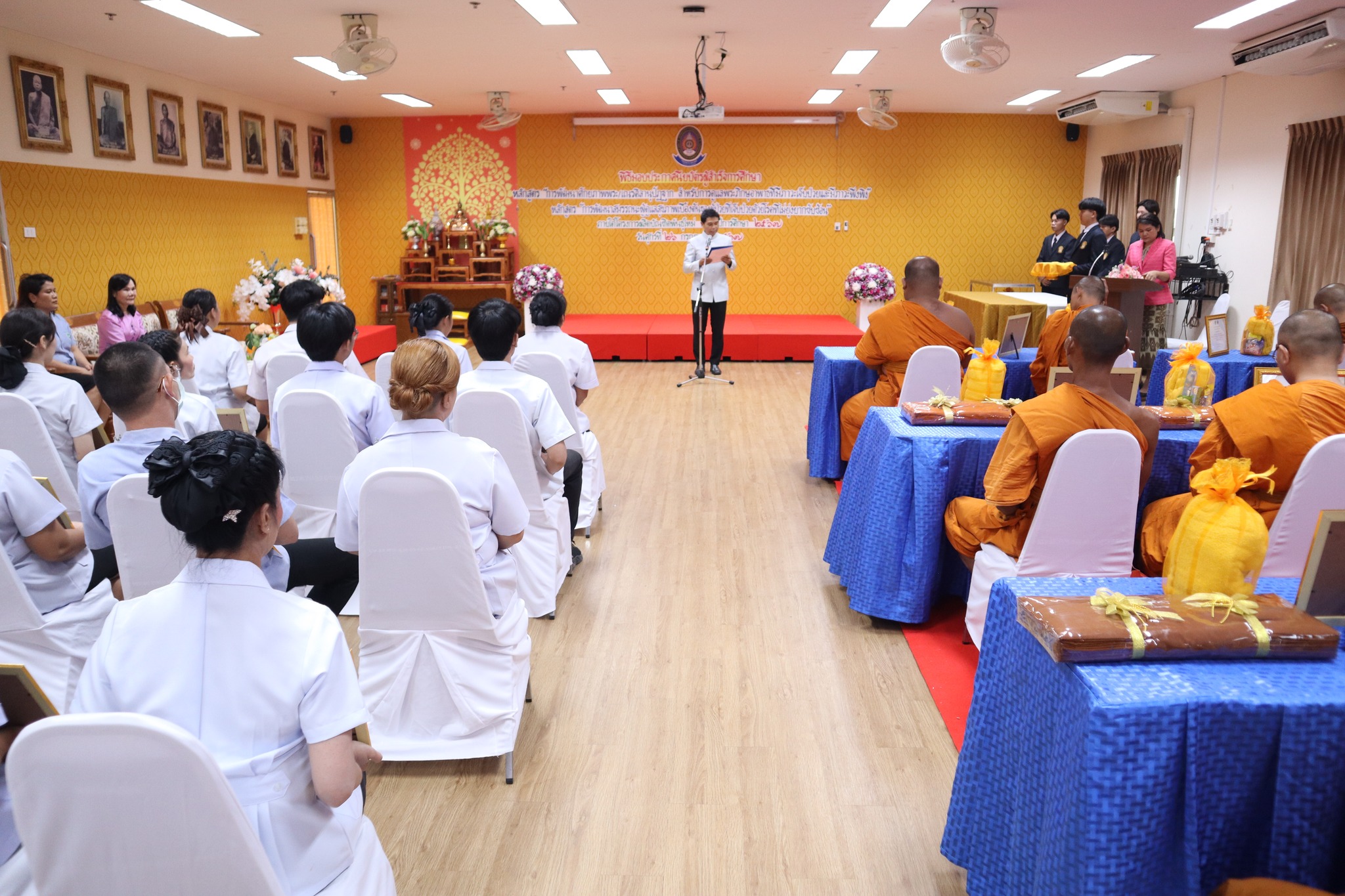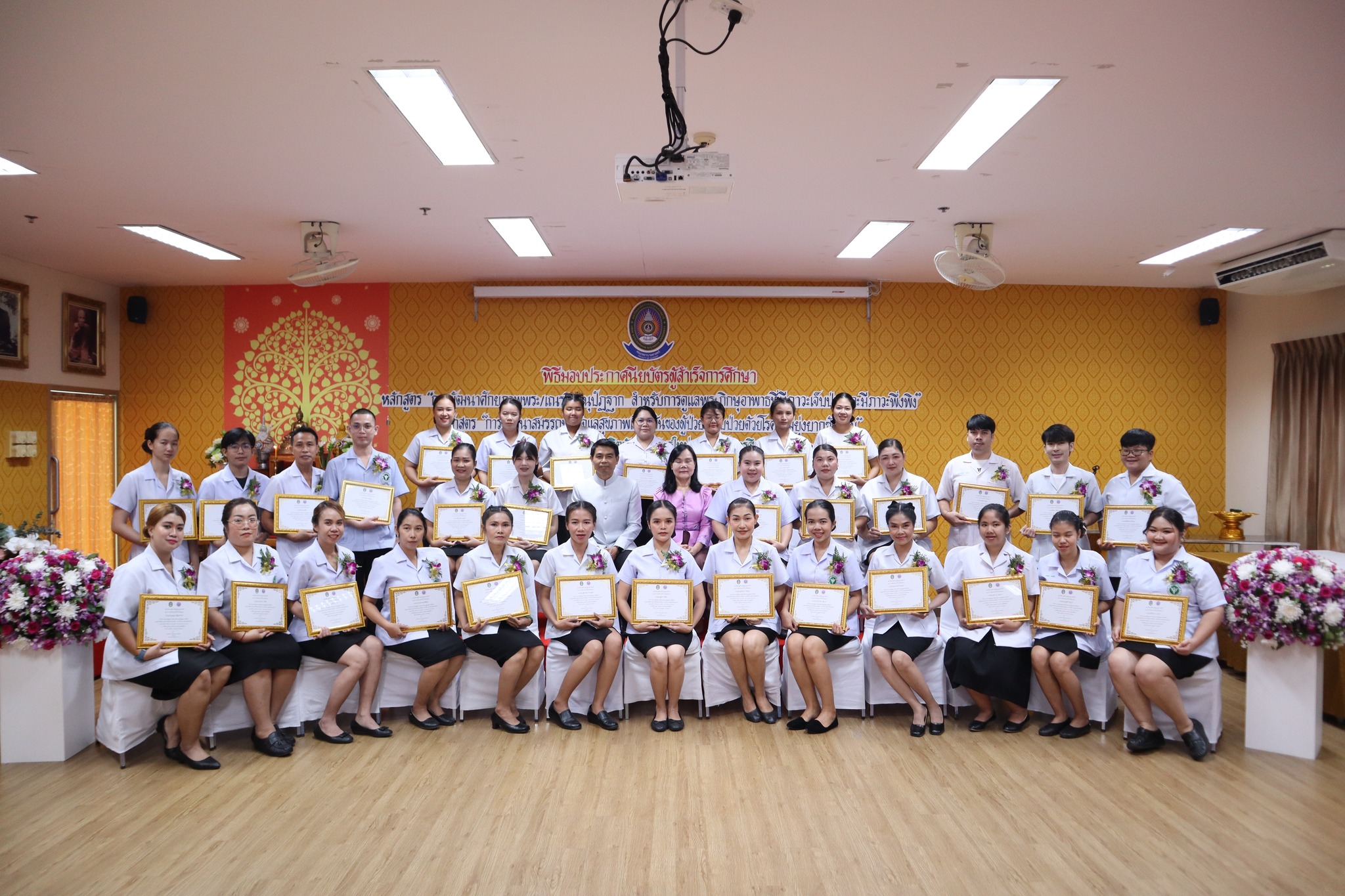 พิธีมอบประกาศนียบัตรผู้ผ่านการอบรมหลักสูตร “การพัฒนาศักยภาพพระ/เณรคิลานุปัฏฐาก สำหรับการดูแลพระภิกษุอาพาธที่มีภาวะเจ็บป่วยและมีภาวะพึ่งพิง” หลักสูตร“การพัฒนาสมรรถนะผู้ดูแลสุขภาพเบื้องต้นของผู้ป่วยที่เจ็บป่วยด้วยโรคที่ไม่ยุ่งยากซับซ้อน” ภายใต้โครงการผลิตบัณฑิตพันธุ์ใหม่ ปี พ.ศ. ๒๕๖๗ -- วันที่ ๒๖ กรกฎาคม ๒๕๖๗ คณะพยาบาลศาสตร์ จัดพิธีมอบประกาศนียบัตรผู้ผ่านการอบรมหลักสูตร “การพัฒนาศักยภาพพระ/เณรคิลานุปัฏฐาก สำหรับการดูแลพระภิกษุอาพาธที่มีภาวะเจ็บป่วยและมีภาวะพึ่งพิง” และหลักสูตร“การพัฒนาสมรรถนะผู้ดูแลสุขภาพเบื้องต้นของผู้ป่วยที่เจ็บป่วยด้วยโรคที่ไม่ยุ่งยากซับซ้อน” ภายใต้โครงการผลิตบัณฑิตพันธุ์ใหม่ ปี พ.ศ. ๒๕๖๗ โดยมี ผู้ช่วยศาสตาจารย์ศักดา บุญยืด รองอธิการบดี เป็นประธานในพิธีและมอบใบประกาศนียบัตรในครั้งนี้ ณ ห้อง ๕๒.๔๐๓ อาคารวิทยาศาสตร์สุขภาพ มหาวิทยาลัยราชภัฏอุบลราชธานี
