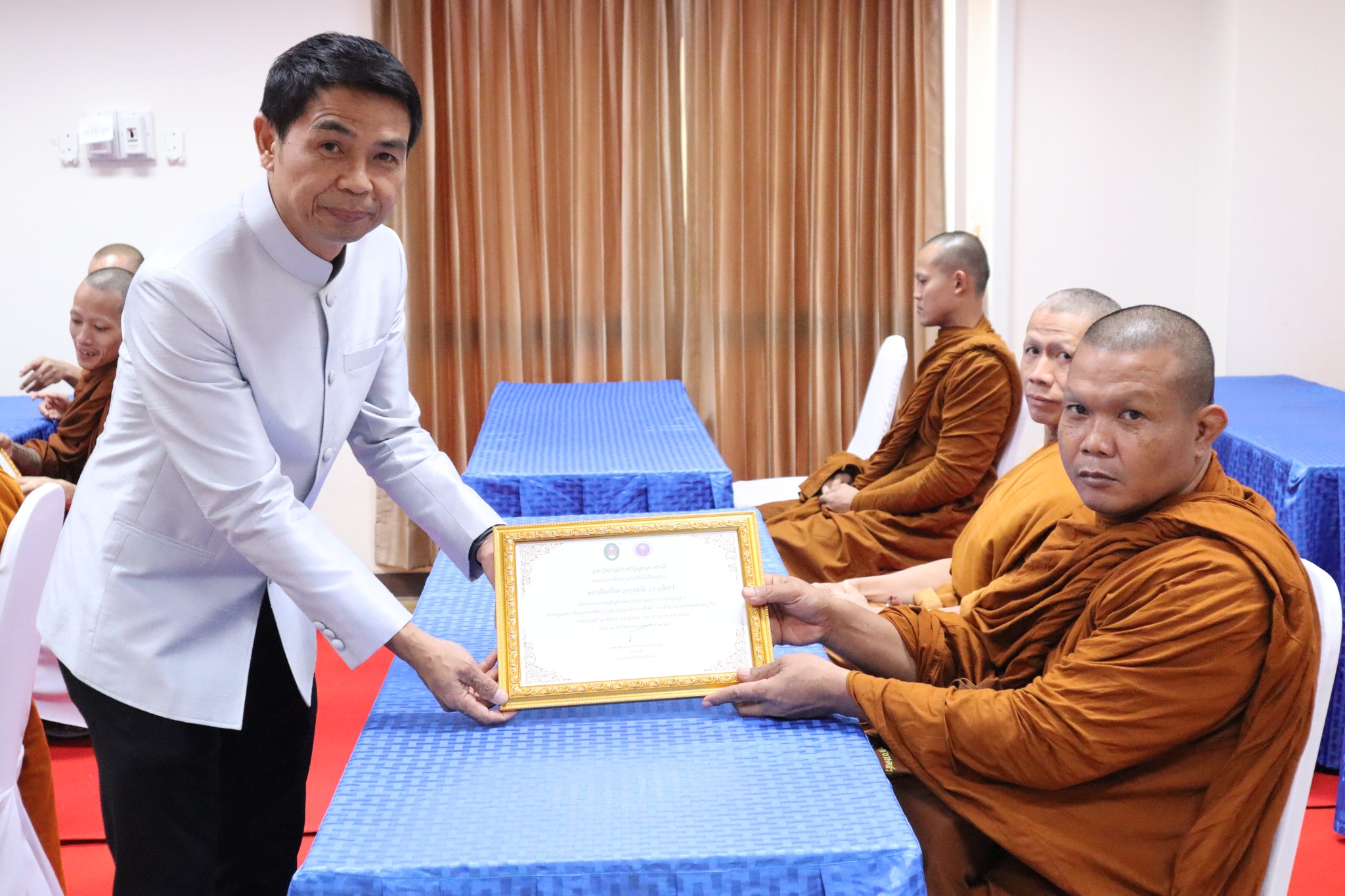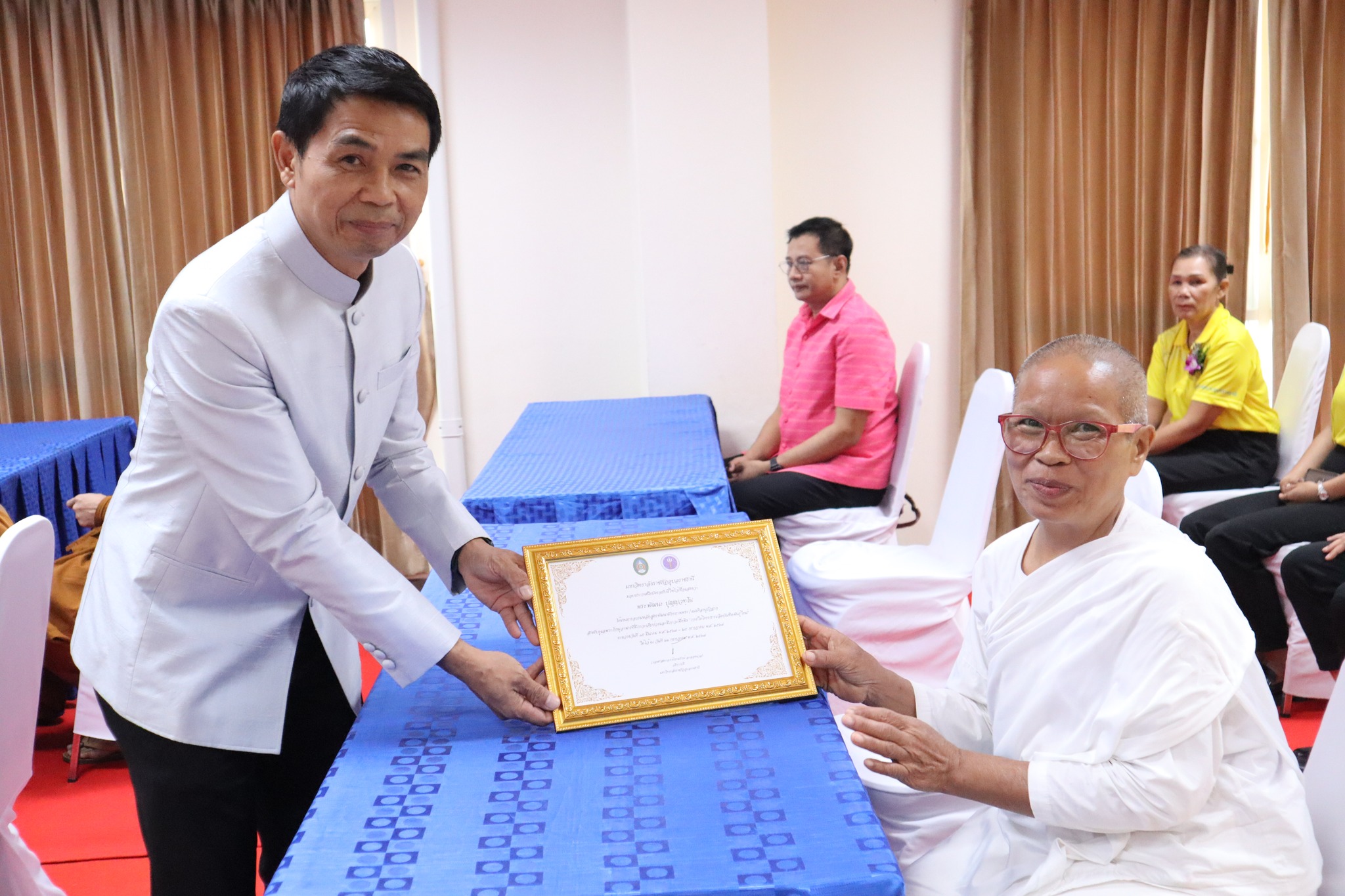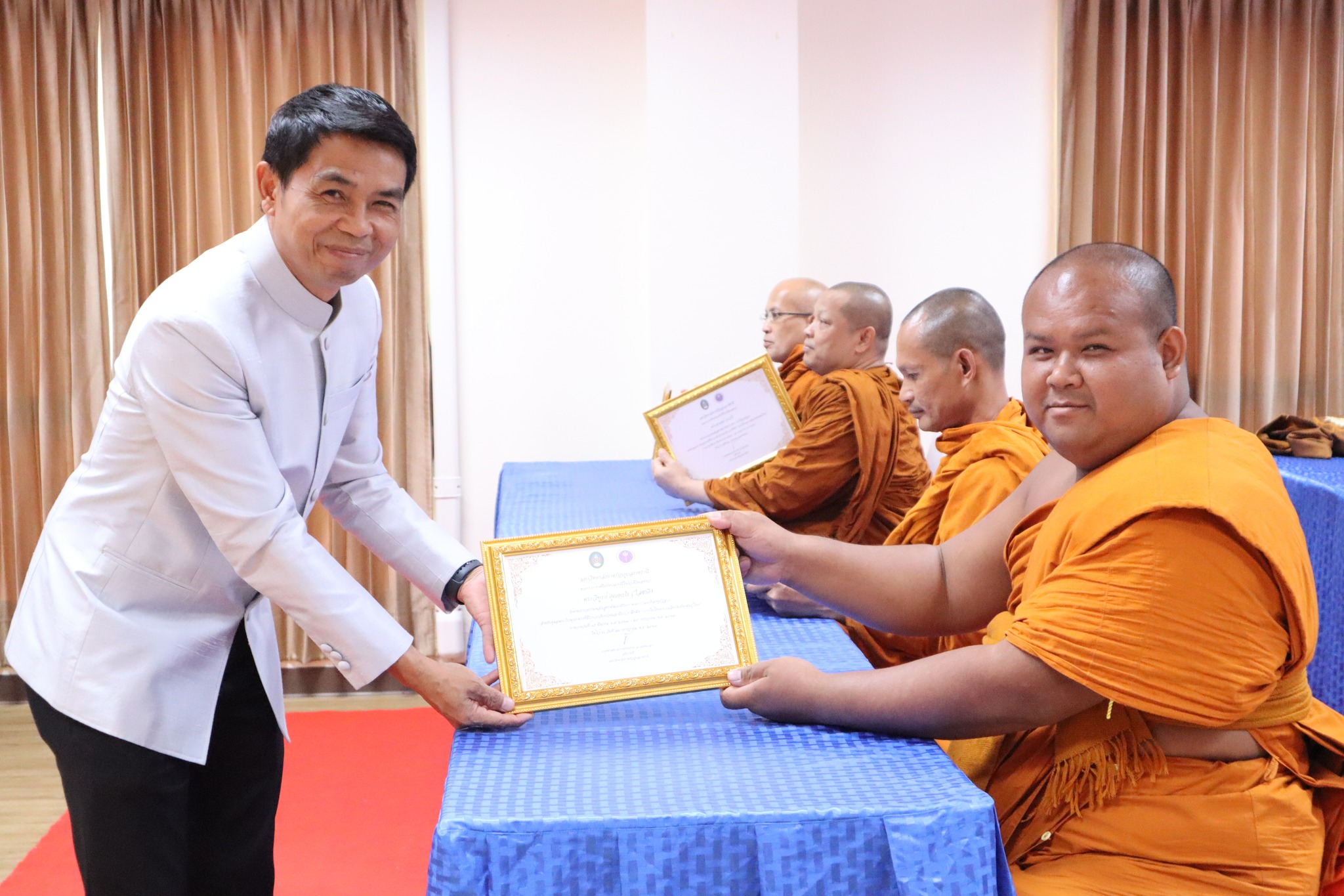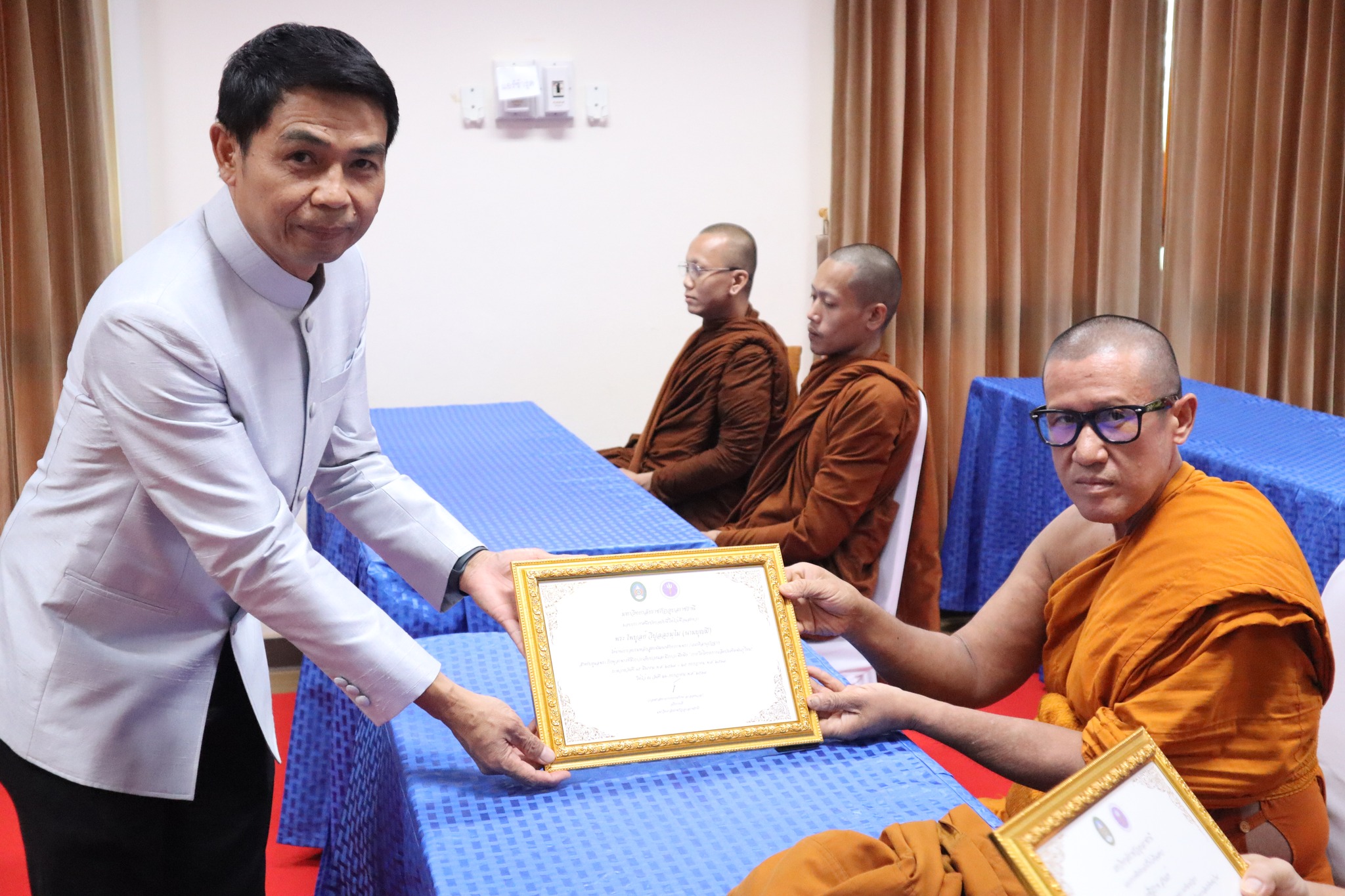 พิธีมอบประกาศนียบัตรผู้ผ่านการอบรมหลักสูตร “การพัฒนาศักยภาพพระ/เณรคิลานุปัฏฐาก สำหรับการดูแลพระภิกษุอาพาธที่มีภาวะเจ็บป่วยและมีภาวะพึ่งพิง” หลักสูตร“การพัฒนาสมรรถนะผู้ดูแลสุขภาพเบื้องต้นของผู้ป่วยที่เจ็บป่วยด้วยโรคที่ไม่ยุ่งยากซับซ้อน” ภายใต้โครงการผลิตบัณฑิตพันธุ์ใหม่ ปี พ.ศ. ๒๕๖๗ -- วันที่ ๒๖ กรกฎาคม ๒๕๖๗ คณะพยาบาลศาสตร์ จัดพิธีมอบประกาศนียบัตรผู้ผ่านการอบรมหลักสูตร “การพัฒนาศักยภาพพระ/เณรคิลานุปัฏฐาก สำหรับการดูแลพระภิกษุอาพาธที่มีภาวะเจ็บป่วยและมีภาวะพึ่งพิง” และหลักสูตร“การพัฒนาสมรรถนะผู้ดูแลสุขภาพเบื้องต้นของผู้ป่วยที่เจ็บป่วยด้วยโรคที่ไม่ยุ่งยากซับซ้อน” ภายใต้โครงการผลิตบัณฑิตพันธุ์ใหม่ ปี พ.ศ. ๒๕๖๗ โดยมี ผู้ช่วยศาสตาจารย์ศักดา บุญยืด รองอธิการบดี เป็นประธานในพิธีและมอบใบประกาศนียบัตรในครั้งนี้ ณ ห้อง ๕๒.๔๐๓ อาคารวิทยาศาสตร์สุขภาพ มหาวิทยาลัยราชภัฏอุบลราชธานี